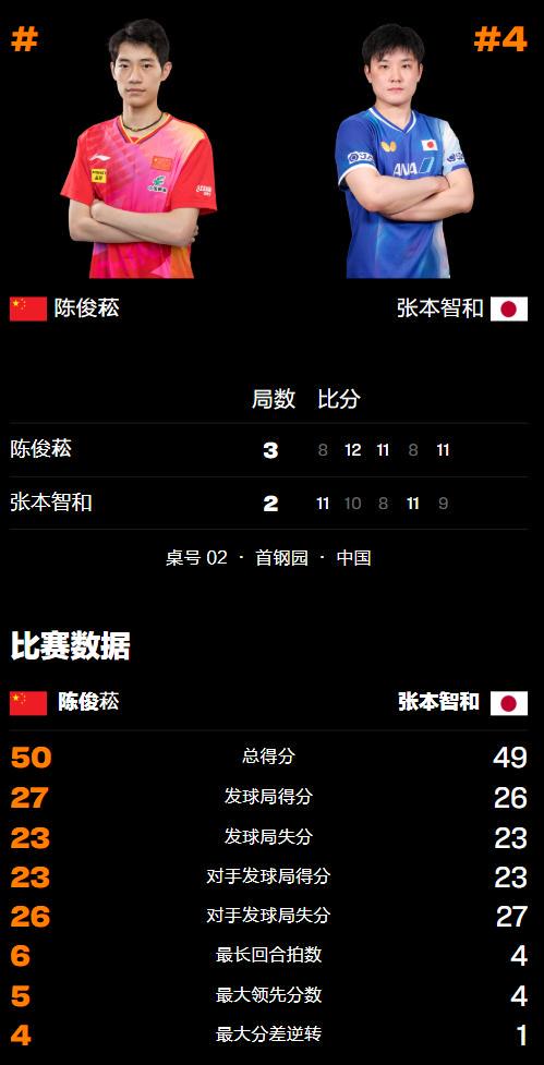 第三局张本智和显然没有迅速从上一局被逆转的阴影中走出,很快便被对手狂轰6-1压制,但陈俊菘在领先的情况下不断出现失误被追至7-6于是暂停进行调整,好在随后稳住阵脚以10-7手握赛点并最终以11-8取胜,张本智和由此而陷入绝境。