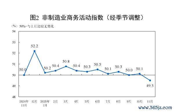11月份,非制造业商务活动指数为49.5%,比上月下降0.6个百分点,非制造业景气水平有所下降。